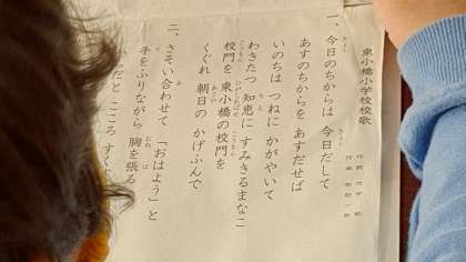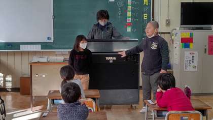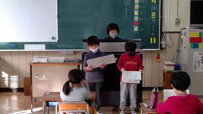 1時間目、1年生が朝の会をしています。「朝の歌ー校歌」を歌っています。
