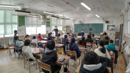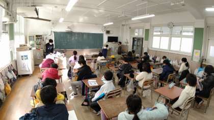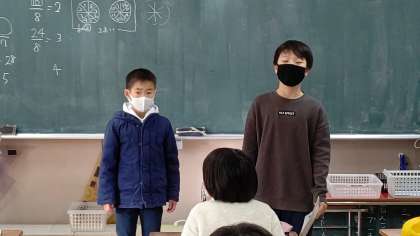 4年生が、朝の会をしています。今日の予定を連絡しています。プリントを配布しています。