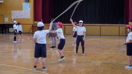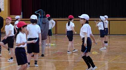 3時間目、4年生が講堂で体育の学習をしています。「縄跳び」を練習しています。おお縄跳びの中で縄跳びをしています。