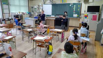 5時間目、1年生が音楽の学習をしています。みんなで間隔をあけて歌っています。