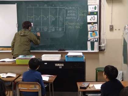 位の学習です。これまでに10のまとまりで1つ大きいくらいに移ることを学習してきました。今日は1000(千)が10このまとまりで10000(1万)になることを学習しました。