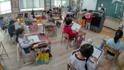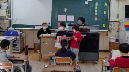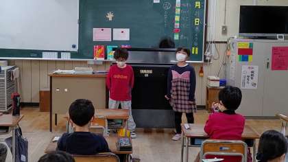 日直さんが、前に出てお話をしています。そのあと、朝の歌「おもちゃのチャチャチャ」を歌っています。
