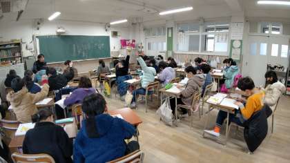 2時間目、5年生が国語の学習をしています。「熟語ー漢字の組み合わせ方」を学習しています。復習したあと、テストをするようです。
