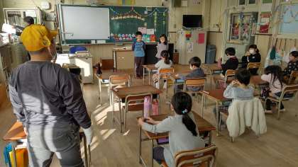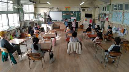 日直さんが前に出て、昨日のお話をしています。みんなの質問にも答えています。