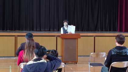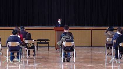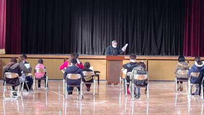 放課後、講堂で新入生保護者説明会がありました。校長先生のあいさつ、山本先生から新入生の持ち物、事務室の貞兼さんから諸届けの連絡、松岡先生から給食についてのお話がありました。