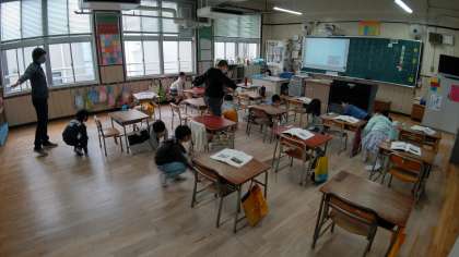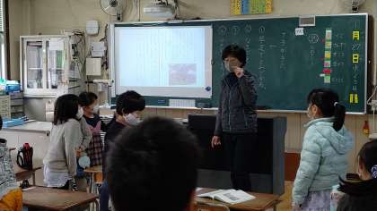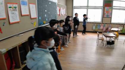 1時間目、1年生が国語の学習をしています。学習内容の「鷹が飛んで来て、小鳥たちが逃げていくようす」を表現しています。