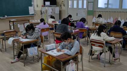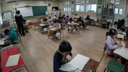 2時間目、3年生が算数の学習をしています。「かけ算の筆算」のテストをしています。