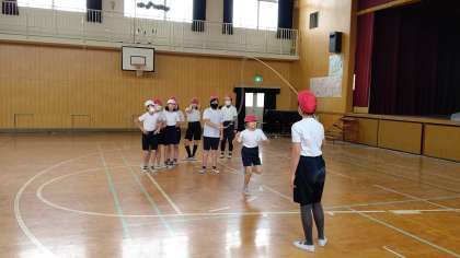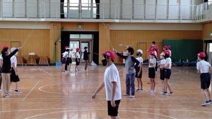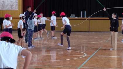 3時間目、5年生が講堂で体育の学習をしています。「長縄跳び」と「ダブルダッチ縄」を練習しています。