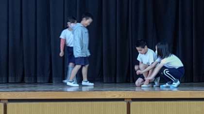 4時間目、3年生が講堂で体育の学習をしています。グループにわかれて、「お宝をゲットしよう」というテーマで、自分たちで考えた「表現運動」を発表しています。