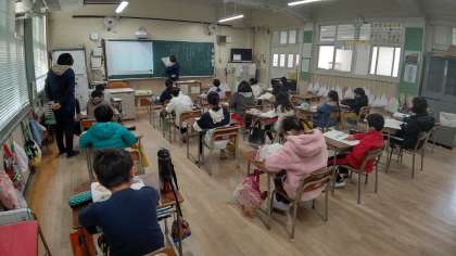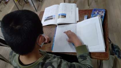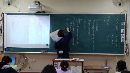 1時間目、3年生が国語の学習をしています。小松義夫さんの「人をつつむ形」ー世界の家めぐりを学習しています。