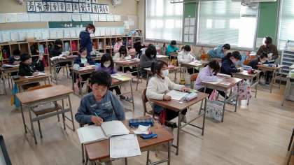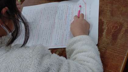 1時間目、3年生が国語の学習をしています。小松義夫さんの「人をつつむ形」ー世界の家めぐりを学習しています。?土地の特徴、人びとのくらし?家の材料?工夫をまとめています。