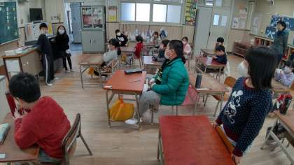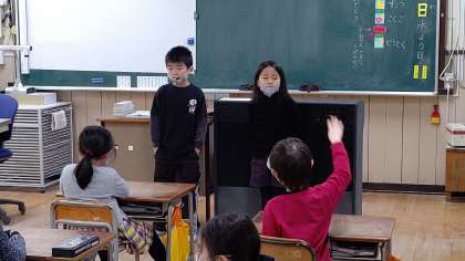 日直さんが前に出て、昨日のお話をしています。みんなの質問にも答えています。