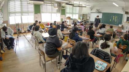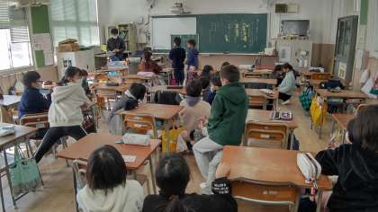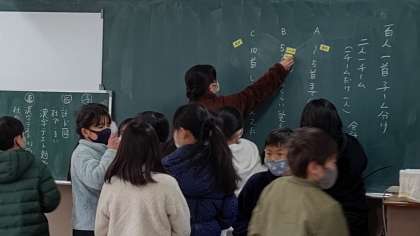 2時間目、4年生が総合の学習をしています。「百人一首のチーム分け」をしています。分けかたを話しあっています。