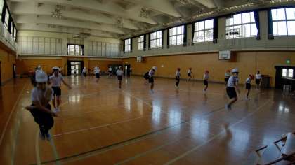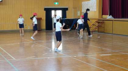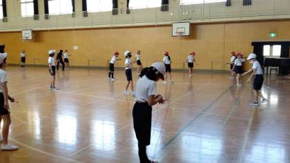 3時間目、5年生が講堂で体育の学習をしています。「なわ跳び」の練習をしています。