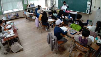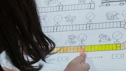 マラソンカードに今日走った距離を色鉛筆で塗っています。