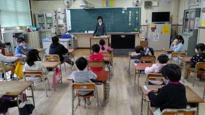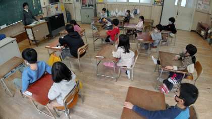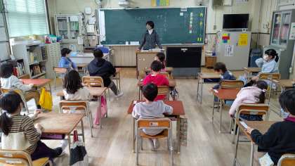 5時間目、1年生が音楽の学習をしています。授業の前に、「けん玉」を持ち帰ってよいかどうか。話しあっています。持ち帰ってよいことになり、ルールを決めています。