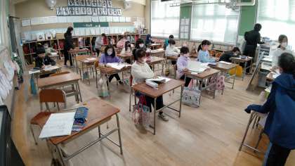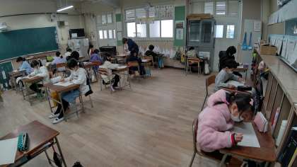 1時間目、3年生が国語の学習をしています。テスト学習のあと、単元「人をつつむ形」のテストをしています。