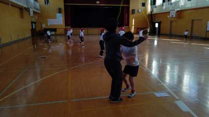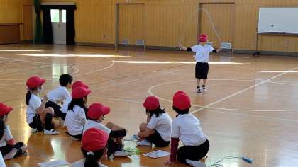 2時間目、1年生が講堂で体育の学習をしています。「なわ跳び」を練習しています。