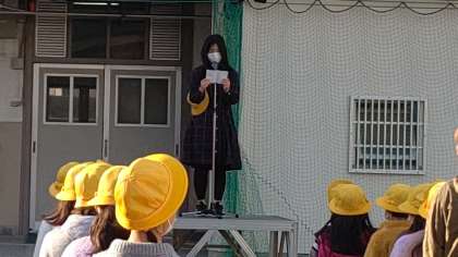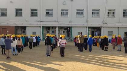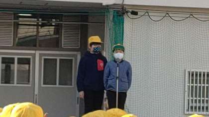 今日は、運動場で全校朝会がありました。校長先生のお話、図書委員会、集会委員会から連絡、木下先生からお話がありました。