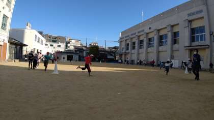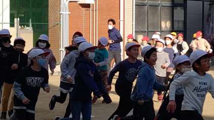 今日は、運動場で3年生と5年生がマラソンをしています。寒さに負けず元気に走っています。