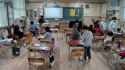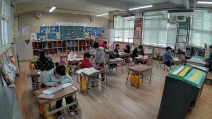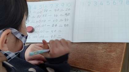 2時間目、1年生が算数の学習をしています。「二けたの引き算」を練習しています。みんなで教えあいをしています。