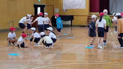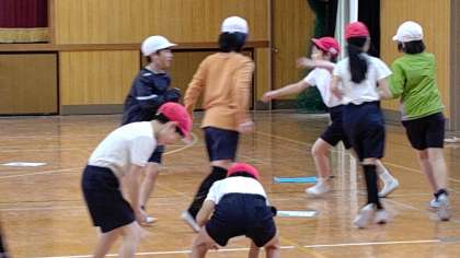 3時間目、4年生が体育の学習をしています。グループに分かれて「表現運動」をしています。カードの指示に従って動いています。