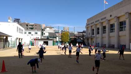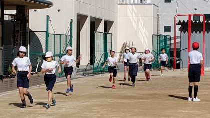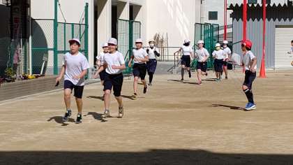 3時間目、5年生が体育の学習をしています。「なわ跳びと持久走」をしています。みんな頑張って走っています。