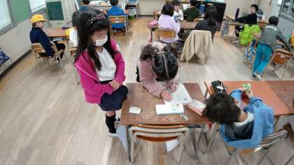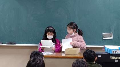 日直さんがせいけつ調べをしています。そのあと、前に出て1分間スピーチをしています。