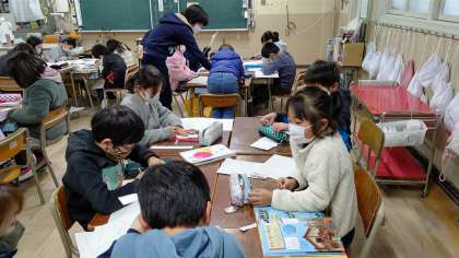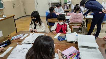 1時間目、3年生が国語の学習をしています。各グループに分かれて、発表の準備をしています。