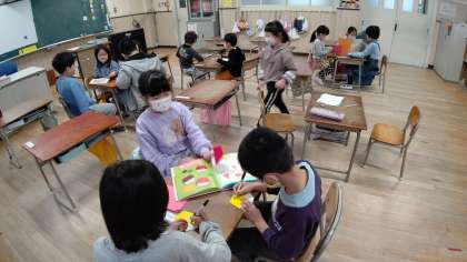1時間目、1年生が学級活動をしています。3月のお誕生会の準備をしています。