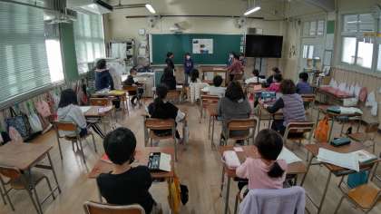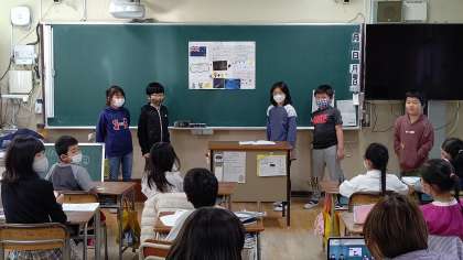 1時間目、3年生が国語の学習をしています。「グループに分かれて、調べた国」について、発表しています。