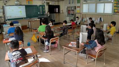 5時間目、1年生が音楽の学習をしています。「にじ」を各パートにわかれて歌っています。