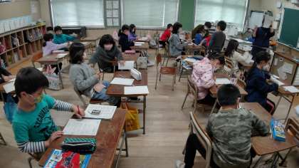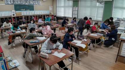 朝の会で、算数「小数」問題プリントの答え合わせをしています。