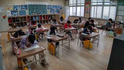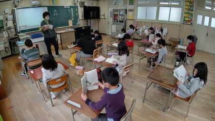 1時間目、1年生が国語の学習をしています。漢字「森」を学習しています。「スイミー」を読んでいます。