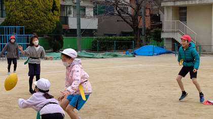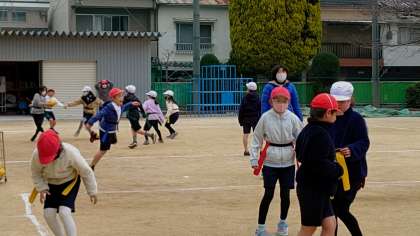 4時間目、3年生が運動場で体育の学習をしています。「タグラグビー」をしています。寒さに負けずに、みんな元気に走り回っています。