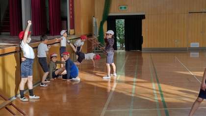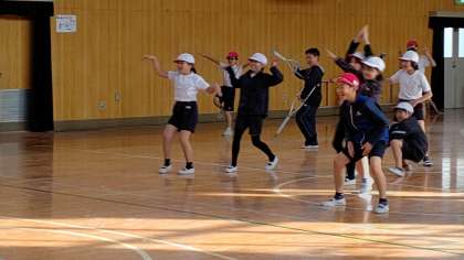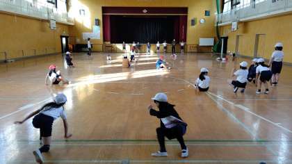 6時間目、4年生が講堂で体育の学習をしています。「表現運動」をしています。