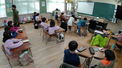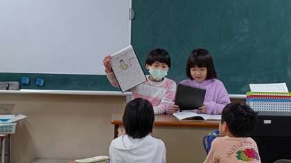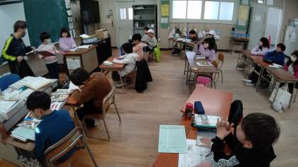 朝の会で、日直さんが前に出て、昨日のお話をしています。せいけつ調べをしています。