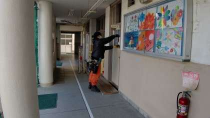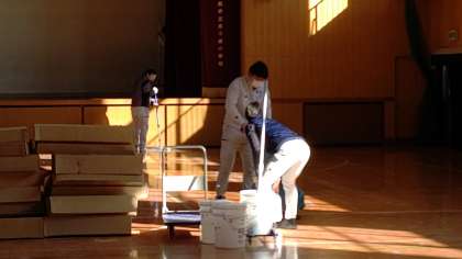 今日は、「窓ふき」「講堂ワックスがけ」「運動場ニガリまき」をしています。卒業式に向けて、環境整備をしています。