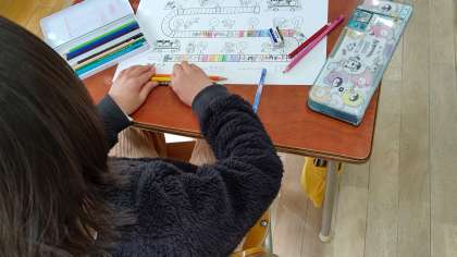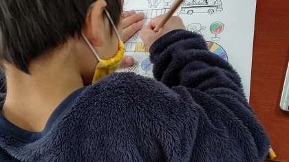 5時間目、1年生が音楽の学習の前に、体育の時間に運動場を何周走ったかをマラソンカードに記入しています。
