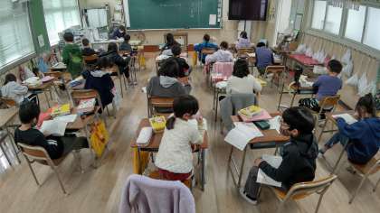 5間目、3年生が国語の学習をしています。1時間目に続いて、茂市久美子さんの物語「ゆうすげ村の小さな旅館ーウサギのダイコン」の意味調べをしています。