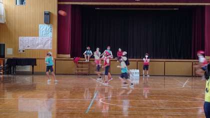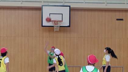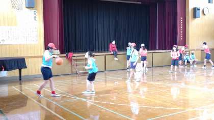 1時間目、6年生が講堂で体育の学習をしています。「バスケットボール」のゲームをしています。