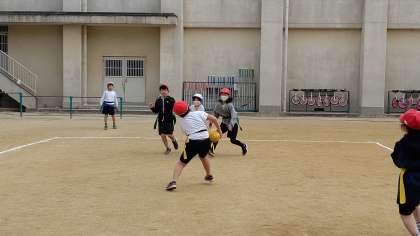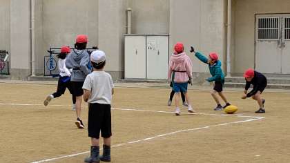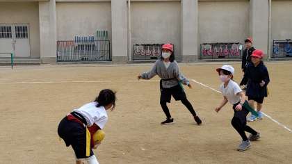 4時間目、3年生が運動場で体育の学習をしています。「タグラグビー」のゲームをしています。チームで作戦を考えて、ゲームをしています。