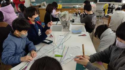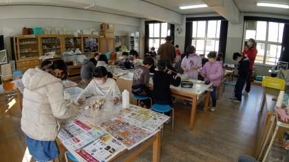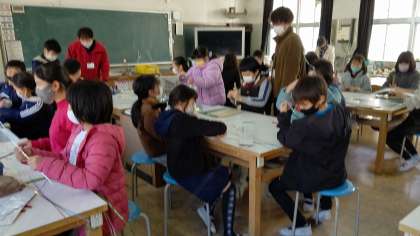 5時間目、5年生が理科室で図工の学習をしています。「ワイアーアート」の作品を作っています。