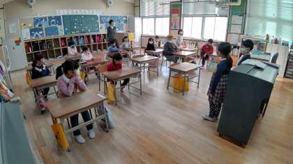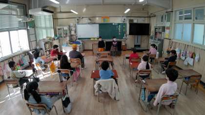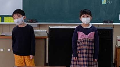 1年生が朝の会をしています。日直さんが前に出て、お話をしています。みんなの質問にも答えています。