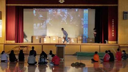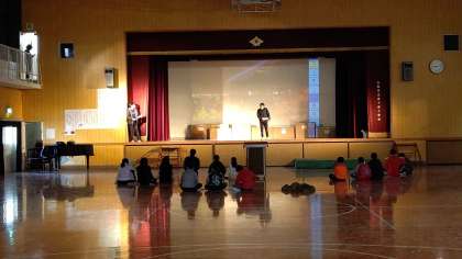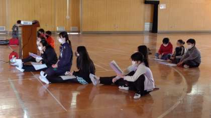 1時間目、6年生が総合の学習をしています。講堂で「歴史劇」の練習をしています。みんな熱心に練習しています。
