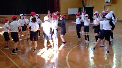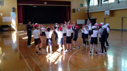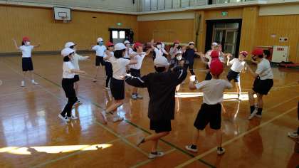 5時間目、講堂で体育の学習をしています。「音楽のリズム」に合わせて、ダンスをしています。
