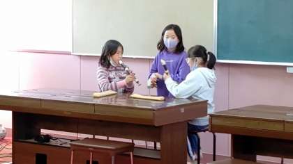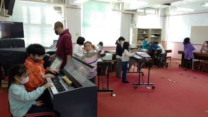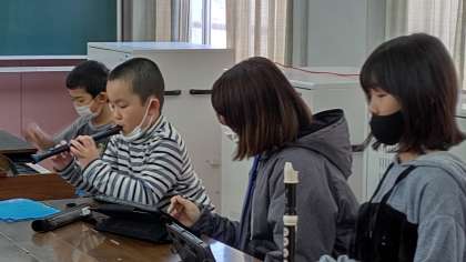 5時間目、3年生が音楽室で「パフ」の合奏を練習しています。