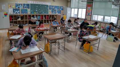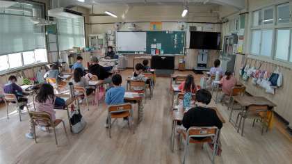 1年生が朝の会をしています。マラソンカードに今日の記録を書いています。終わった人は、読書をしています。