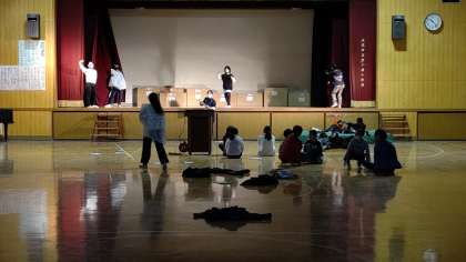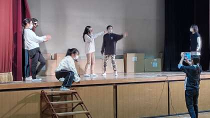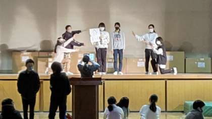 2時間目、6年生が講堂で総合の学習をしています。舞台発表の練習をしています。