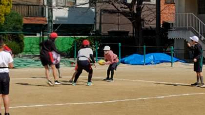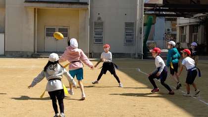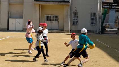 4時間目、3年生が運動場で体育の学習をしています。「タグラグビー」のゲームをしています。